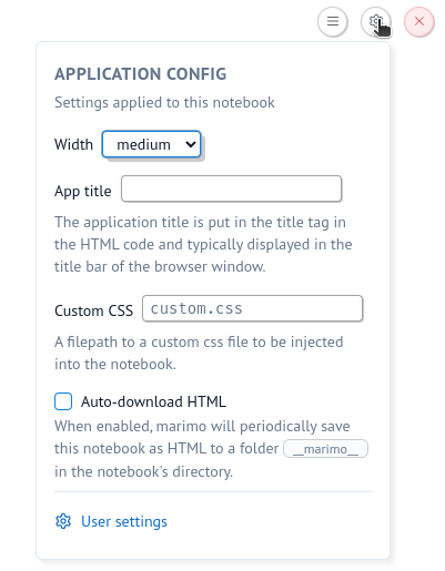 marimo offers two types of configuration: User Configuration and App Configuration. Both can be easily managed through the Settings menu in the marimo editor.